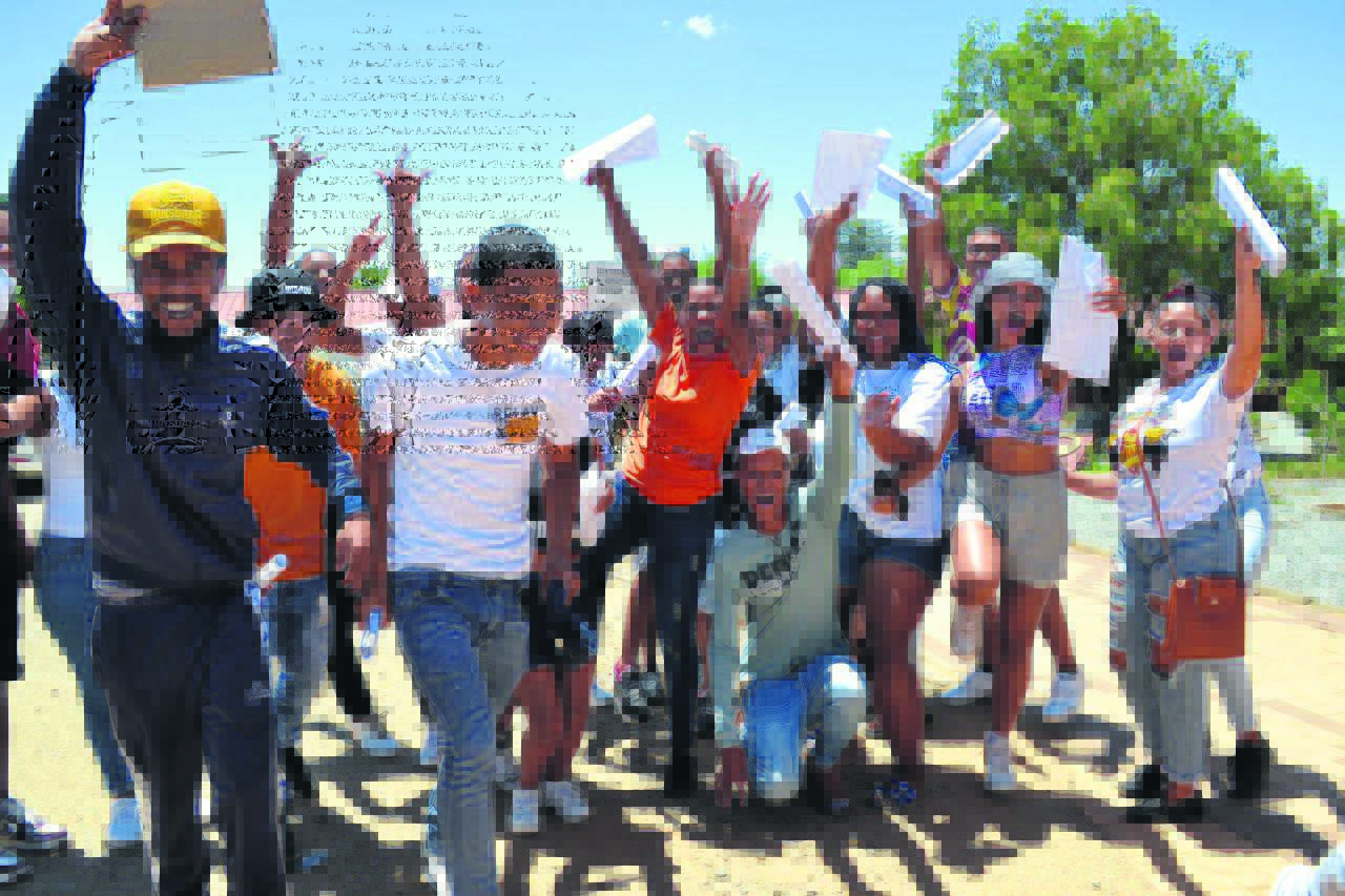 Dit was ’n blye oomblik vir die groep matrieks van 2022 toe hulle Vrydag 20 Januarie hul seniorsertifikaateksamenuitslae ontvang het. Schoonspruit het ’n 79,6%-slaagsyfer behaal. Foto: Anan Jacobs