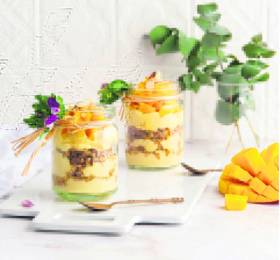 1. Alternate the yoghurt, granola and mango in layers in four serving bowls or pots of your choice.