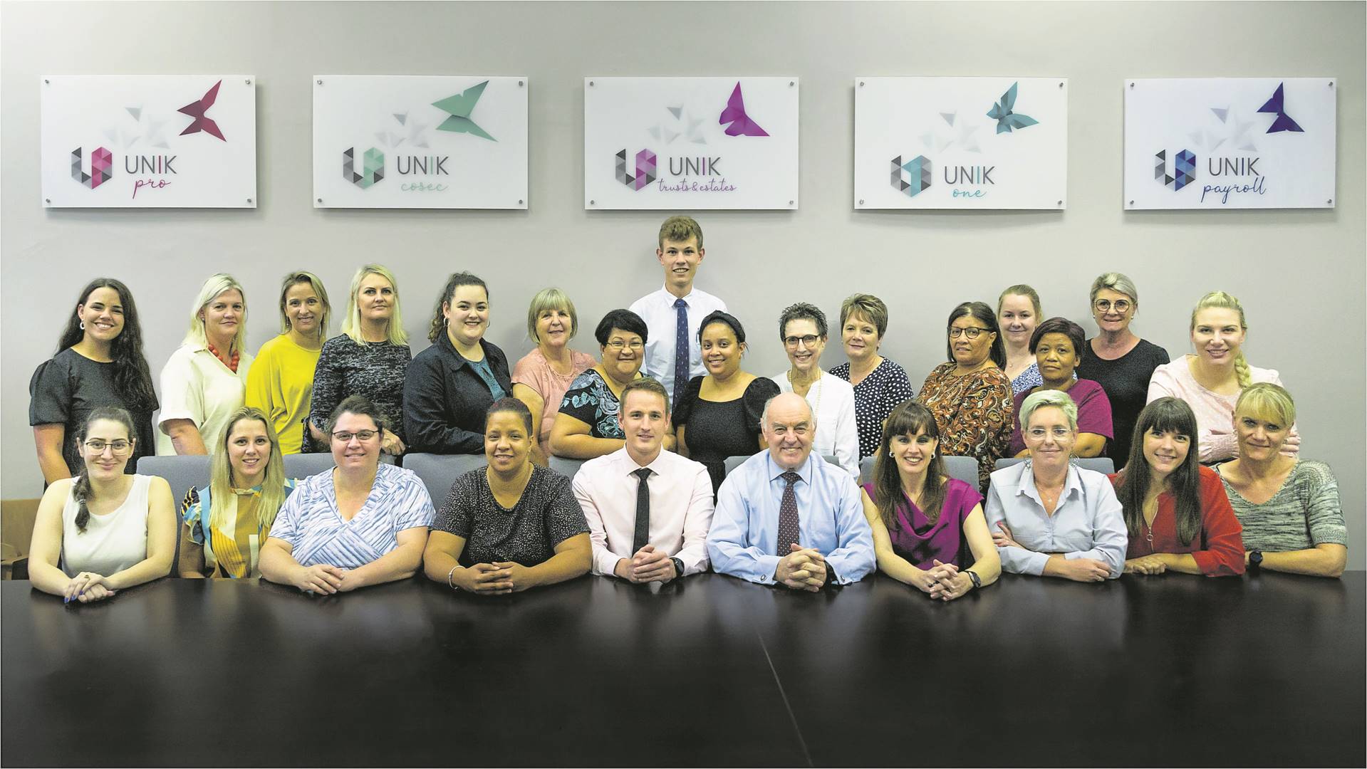 By De Jager Boshoff word die personeel as een van hul boustene vir sukses beskou. Agter (van links) is Hernù Schep, Kayla Nel en Sorita Loubser. Middel: Marinah Gouws, Susan Nieuwoudt (19 jaar diens), Chrisanne Gerber, Christine Hartley (14 jaar diens), Anina Hill, Daleen Louw (40 jaar diens), Elmolene Goliath (28 jaar diens), Maulisha Markus, Marietjie Batt (10 jaar diens), Dawn Linde, Lewiesa Markus (29 jaar diens), Christine Demas (18 jaar diens) en Lizé van Greunen (bestuur). Voor is die bestuurspan: Jayd Wasmuth, Hes-Marè van der Vyver (10 jaar diens), Suzanne Mostert (16 jaar diens), Sharonay Solomons (12 jaar diens), LC Uys (Direkteur), Chris de Jager (Direkteur), Oddette Boshoff (Direkteur), Petro van Deventer (18 jaar diens), Chanelle Cloete en Hilmari Mouton (Direkteur) (16 jaar diens). Foto: Herman Olivier