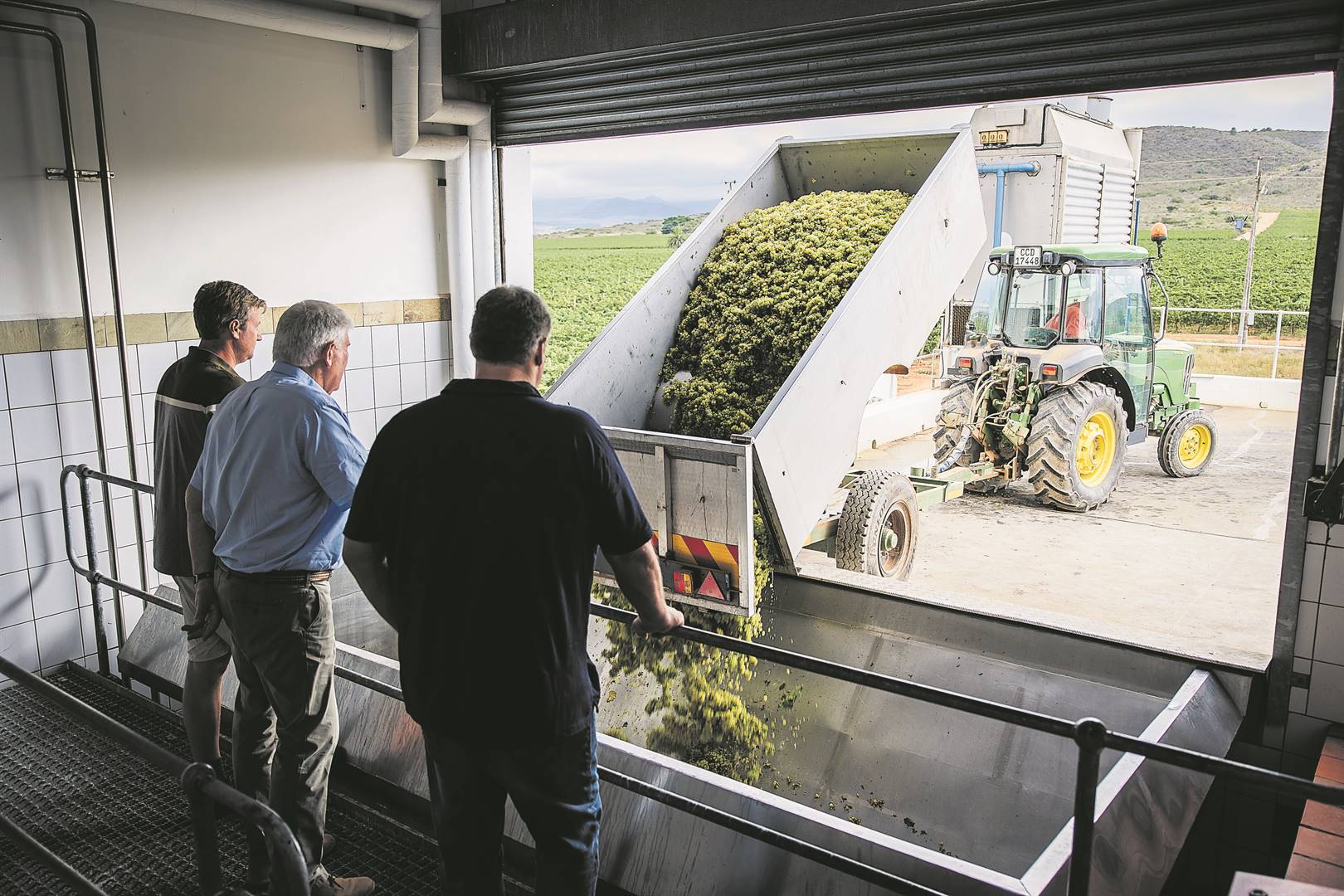 Parstyd by De Wetshof-wynlandgoed is in volle swang. Danie de Wet en sy seuns kyk hoe word nog ’n vrag druiwe vir pars afgelaai. Foto: