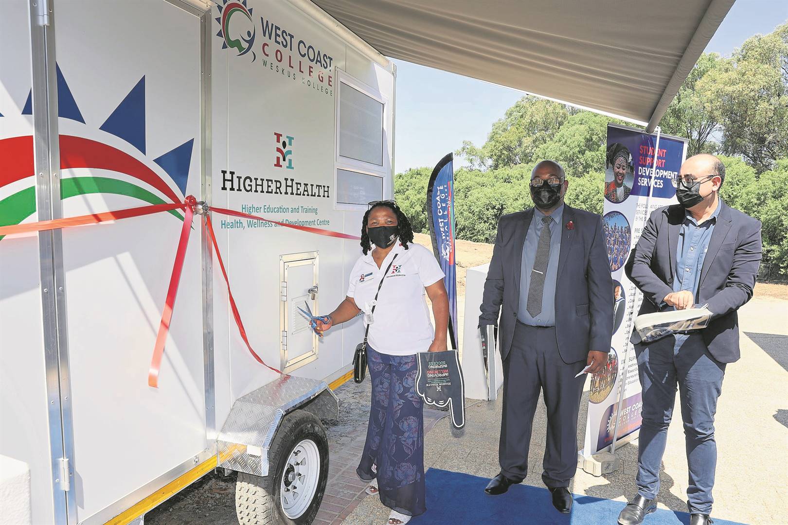 The Western Cape MEC for Health, Dr Nomafrench Mbombo, together with Prof Ramneek Ahluwalia, CEO of Higher Health, an organisation that originates measure to boost health-care responsiveness in partnership with stakeholders such as the Department of Health, officially launched the West Coast College Mobile Clinic, which will take to the streets to serve the college’s student communities by making health care accessible to them. The clinic forms part of health-and-wellness awareness campaigns on campus that support students with family planning, TB screening and vaccinations, to name a few. “West Coast College believes that health is just [as] an essential part of our students and their time at the college as their academic development, and this clinic will support us to holistically develop our students who need these services,” says Rhazia Hamza, Deputy Principal: Innovation and Development of West Coast College. Pictured (from left) are Mbombo, West Coast College principal Lungisa Mbulawa and Ahluwalia. Photo: Nickay Productions