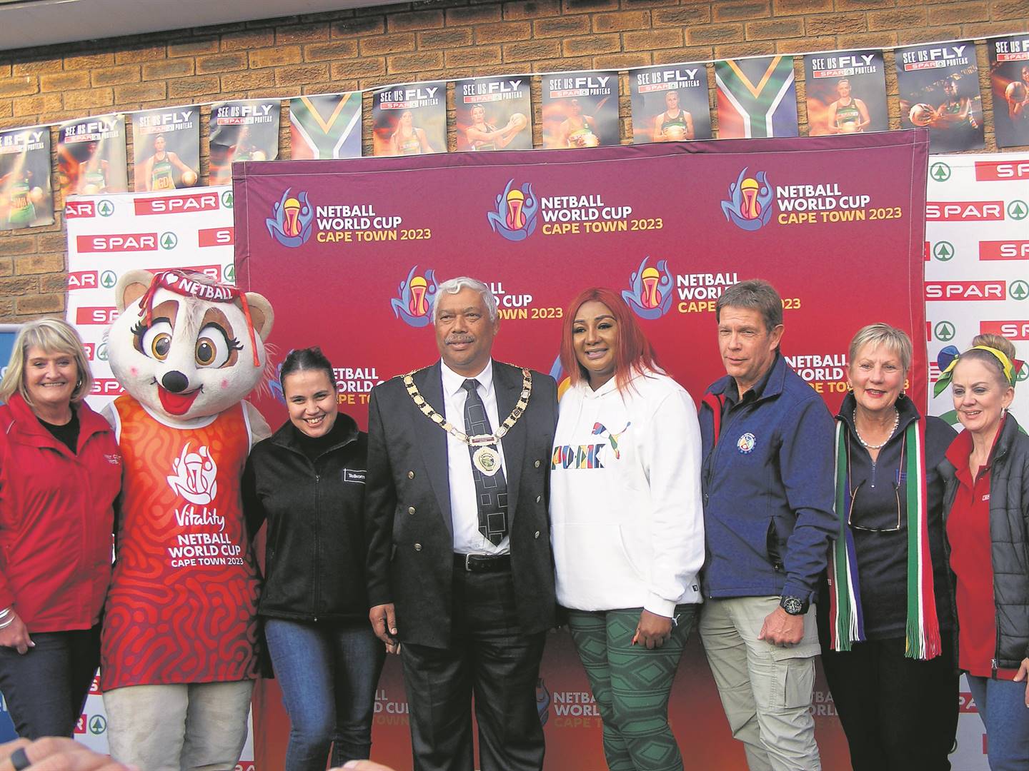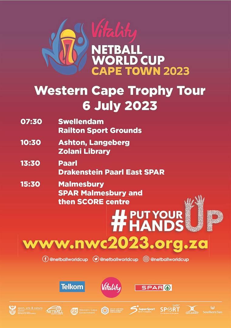 Die opkomende Vitality Netbalwêreldbekertoernooi se trofeetoer het die afgelope Donderdag ’n draai in Malmesbury kom maak. Verskeie toeskouers, ondersteuners en ywerige netbalspelers van plaaslike skole het lede van die toerspan opgewonde ingewag. Die gesogte trofee is saam met lede van die toerspan verbonde aan die Spar-Proteas-netbalspan en SA Netbal deur die SAPD en munisipale amptenare van die Swartland na hul onderskeie bestemmings vergesel. Hul eerste besoek was by Malmesbury-Superspar, gevolg deur ’n besoek aan die plaaslike gemeenskapsportsentrum, Score. Die wêreldbekertoernooi begin eersdaags – op 28 Julie – by die internasionale konvensiesentrum in Kaapstad (KIKS) en duur tot 6 Augustus. Die internasionale netbaltoernooi vind die eerste keer op eie bodem plaas. Die uitvoerende burgemeester van die Swartland, Harold Cleophas, het die geleentheid bygewoon. Regs van hom staan die president van SA Netbal, Cecilia Molokwane, saam met Boffie Strydom (die burgemeester van die Weskus-distriksmunisipaliteit) en Anroux Marais (Wes-Kaapse minister van kultuursake en sport). Foto’s: Charlotte Lesch