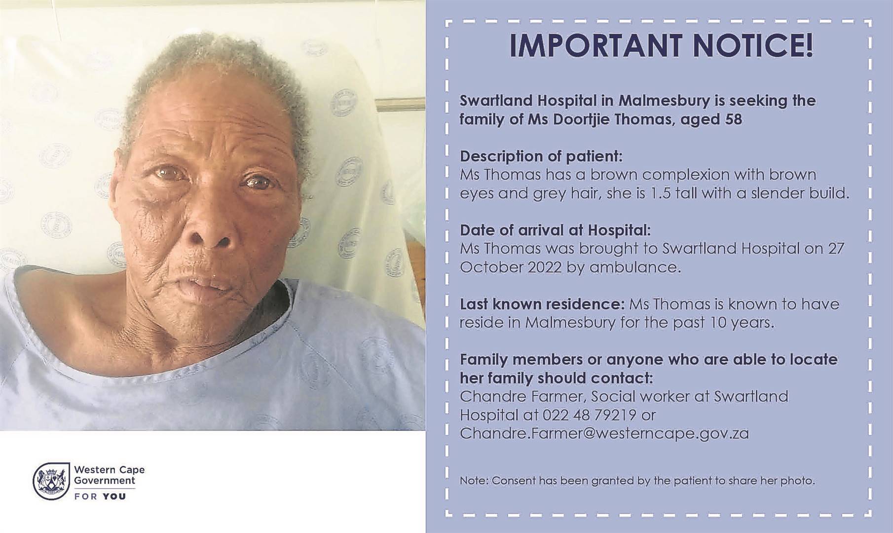Die Paarl-hospitaal is op soek na die familie van Henry Fortuin (ook bekend as “Spieke” of “Kleintjies”).