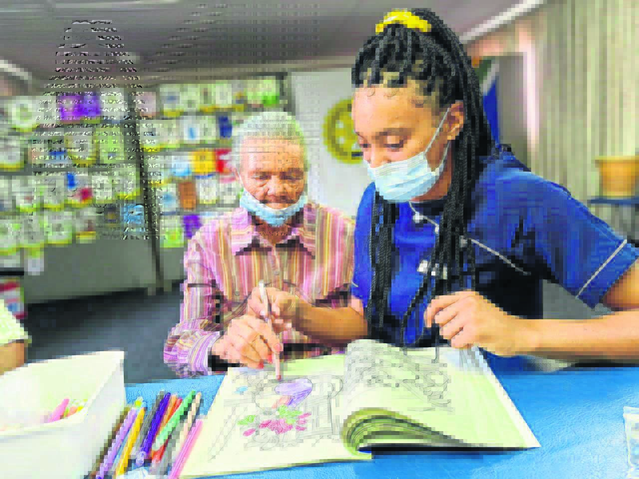 Sencit Resthaven Old Age Home’s Sarah Braaf enjoys colouring with Jade Peters, caregiver at St Rosehaven Sanctuary, a recently established service centre and social hub for the elderly of the Helderberg. Turn to page 4 for more on the establishment, where the elderly can, without judgment, shake themselves loose, be pampered and enjoy their golden years without too much discomfort.Photo: Terzel Rasmus-Williams
