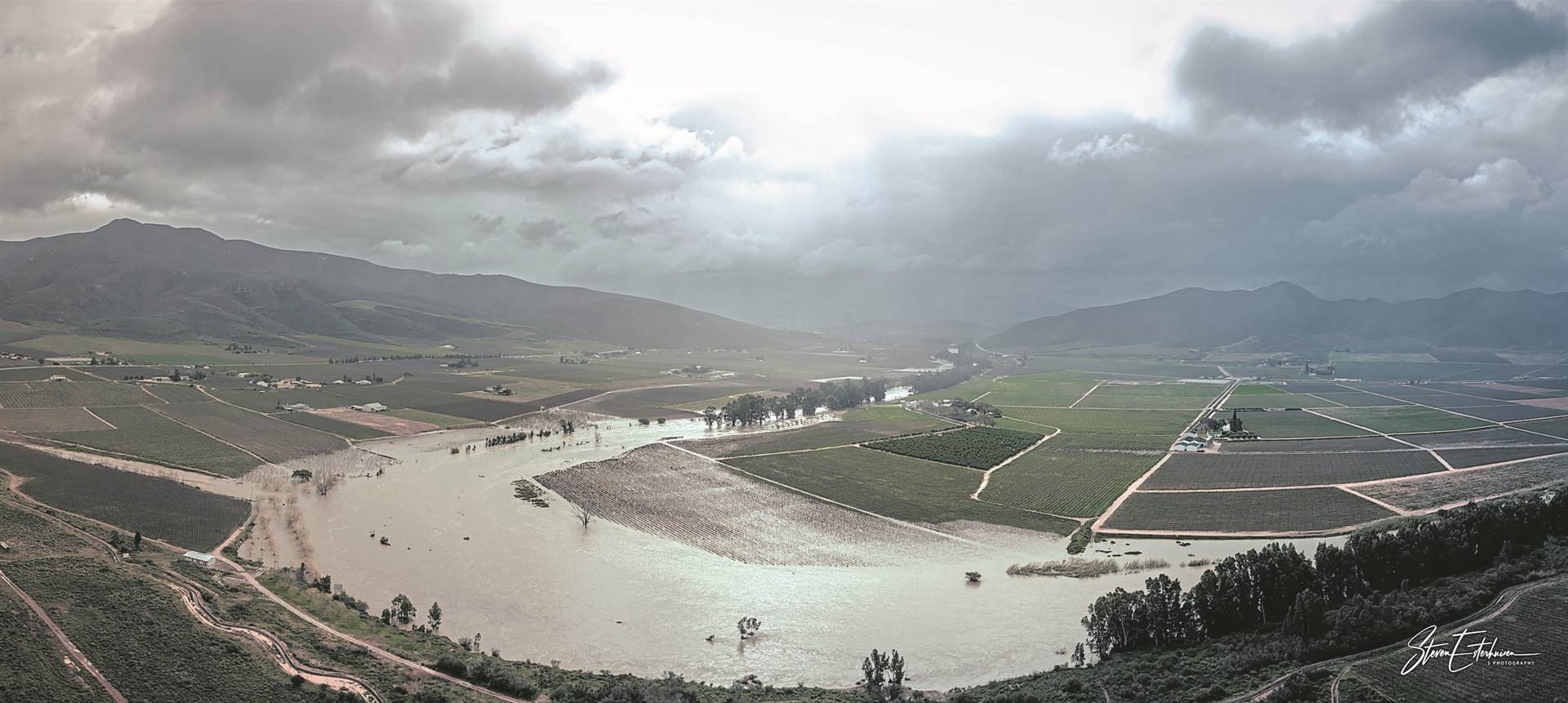 Water het die afgelope week ná swaar reënneerslae in Rawsonville, Worcester en De Doorns behoorlik deur die Breederivier-vallei gevloei, wat tot veral die Breederivier, wat in vloed was, gelei het. Plek-plek is verspoelings veroorsaak. Die McGregor-burg en die Rooibrug voor Bonnievale het onder andere oorstroom en was vir verkeer gesluit, maar is nou weer oopgestel. Ses mense tussen ses en 50 jaar oud was op ’n “eiland’’ in die Breederivier gestrand en moes gered word. Hulle is almal veilig en ongedeerd. Hierdie pragtige lugtoneel is in die omgewing van die Rooibrug tussen Robertson en Worcester geneem. Foto: Steven Esterhuisen