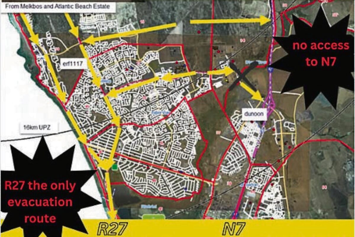 Erf 1117 lies within the 5–16 km radius of Koeberg’s UPZ, a zone where national regulations demand rigorous evacuation modelling before any major population increase. No such modelling has been submitted for this land.