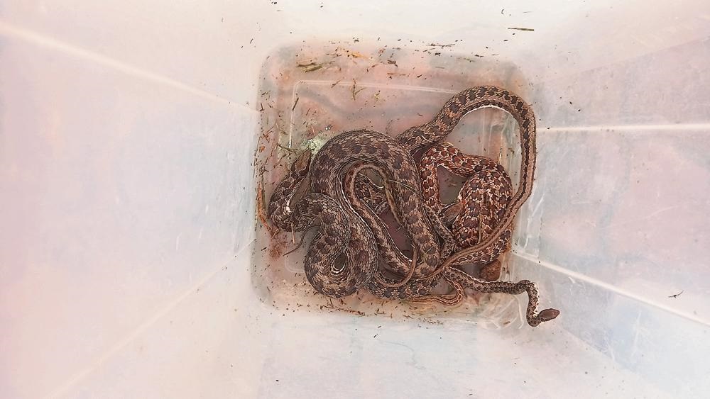Die slange wat uit die water gehaal is, sluit in skaapstekers en bruin waterslange, asook ’n klein muis wat volgens Sansom bedreig is.