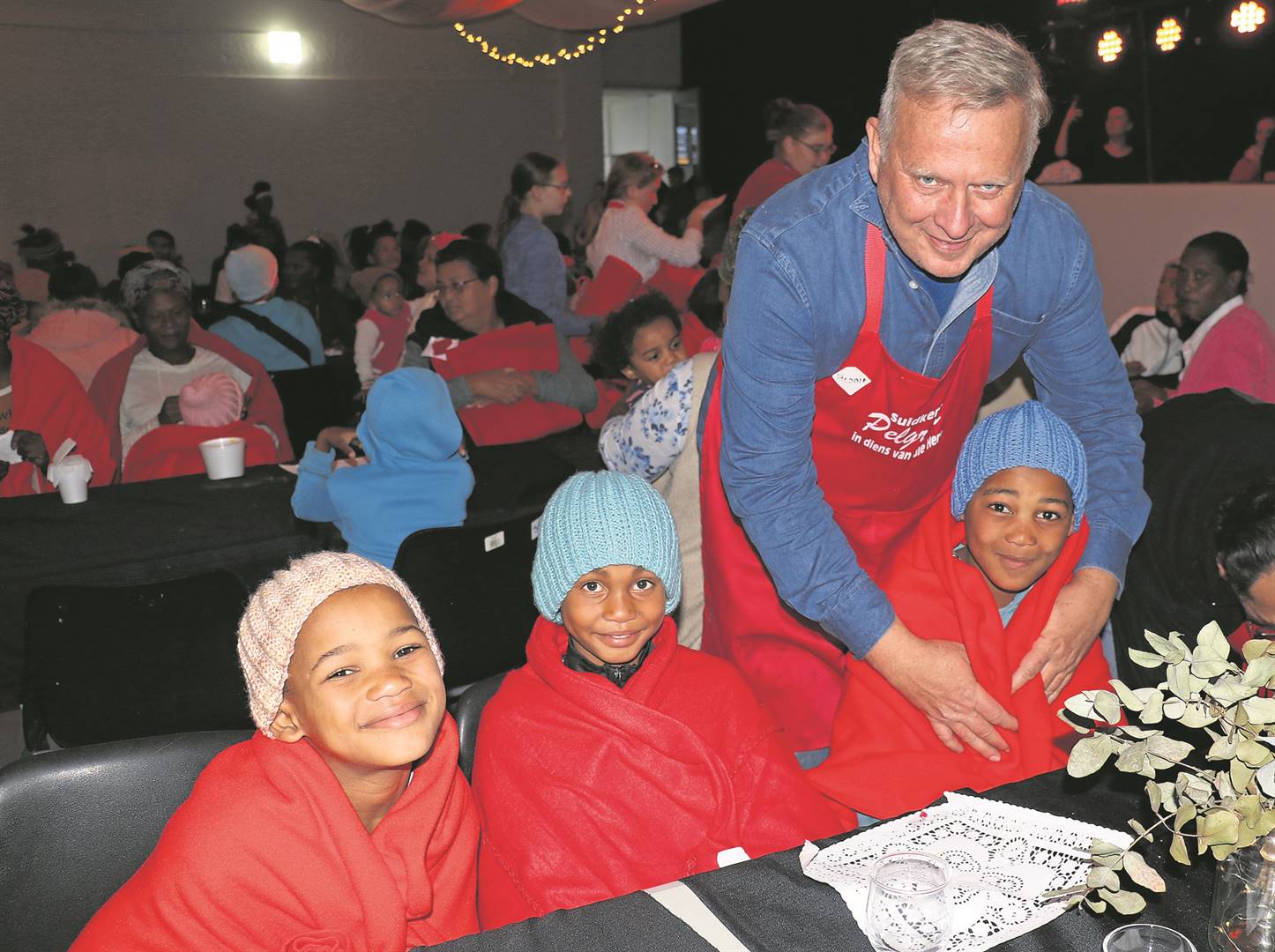 Saterdag se geleentheid is afgesluit met gemeentelede wat tussen die tafels inbeweeg het om ’n rooi kombers om elke gas se skouers te vou met ’n stewige drukkie daarmee saam. Daar is ook gebreide musse uitgedeel.