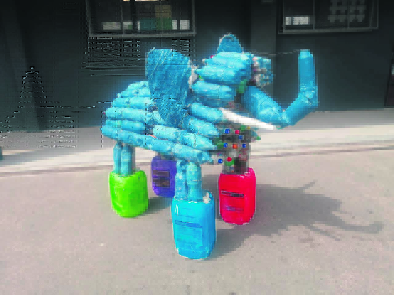 Die beeldhouwerk is ongeveer 1,2 m hoog en 1,5 m lank en is gemaak met herwonne plastiekbottels en ander rommel. Dit is met draad aan mekaar gebind. Vir nou sal dit in die skooltuin vertoon word.