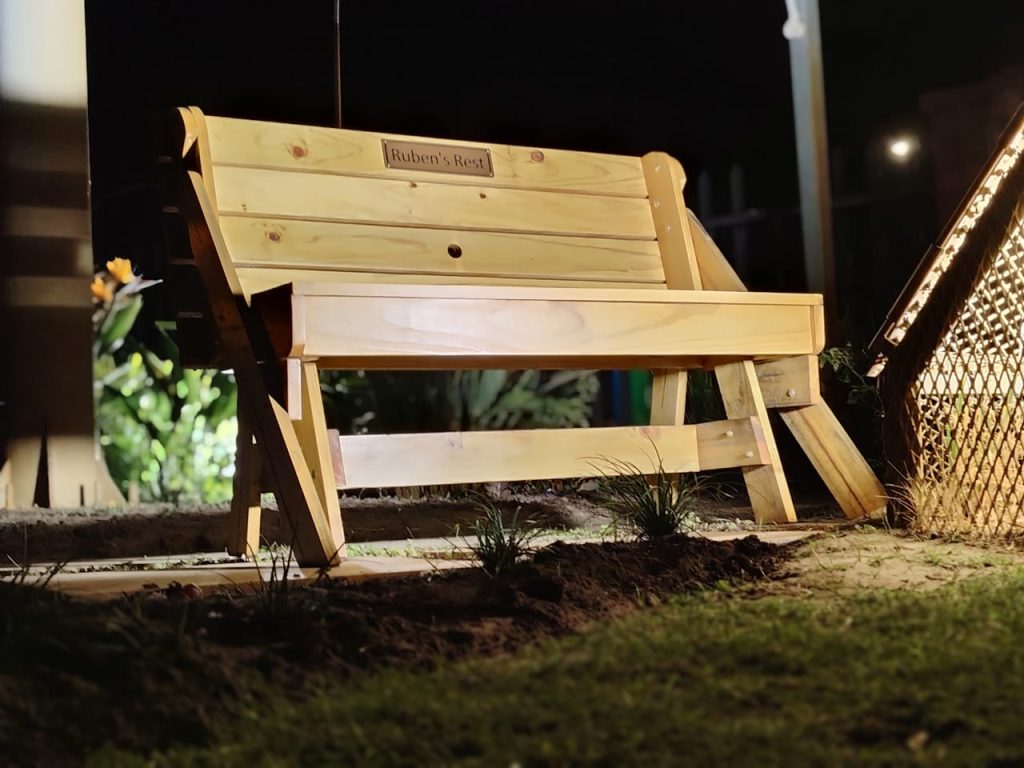 ‘n Bankie gedoop Ruben’s Rest is teen ‘n helder lig vir beligting na ure in dié voortuin geplant.