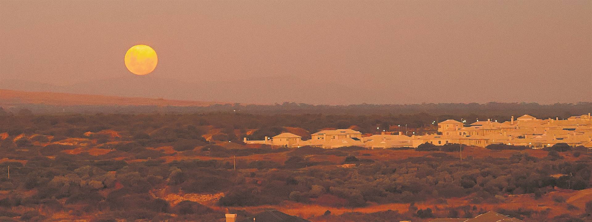 Bidsprinkaanmaan: Januarie se kenmerkende groot geel “Wolfmoon” (of Bidsprinkaanmaan in Suid-Afrika) kom op oor die berg soos gesien vanuit Bloubergstrand. Die volgende volmaan is die “Snowmoon” (oftewel plaaslik die Dassiemaan) op 12 Februarie. Foto: Christa Rossouw