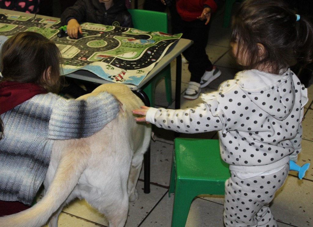 Hy sit geduldig terwyl klein handjies sy kop streel of sagte woorde in sy oor fluister. Sommige kinders lees vir hom storieboeke, en ander druk hul gesiggies in sy donsige pels.