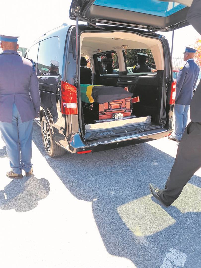 Die polisie het Dougie Dyers se oorskot uit die kerk tot in Haltweg vergesel.