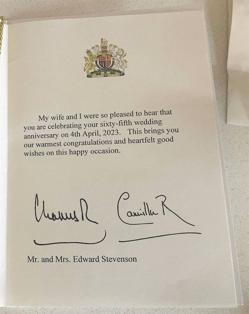 Edward (Eddie) Stevenson and his wife Anne received a letter containing a message congratulating them on celebrating their 65th wedding anniversary from His Royal Highness (HRH) King Charles and Queen Consort Camilla of the British royal family.
