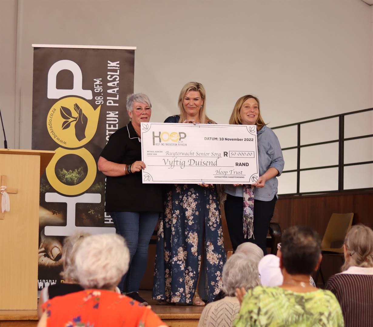 Wilinda Ford en Sunel Beeselaar, wat die Hoop Trust administreer, oorhandig ’n tjek vir R50 000.