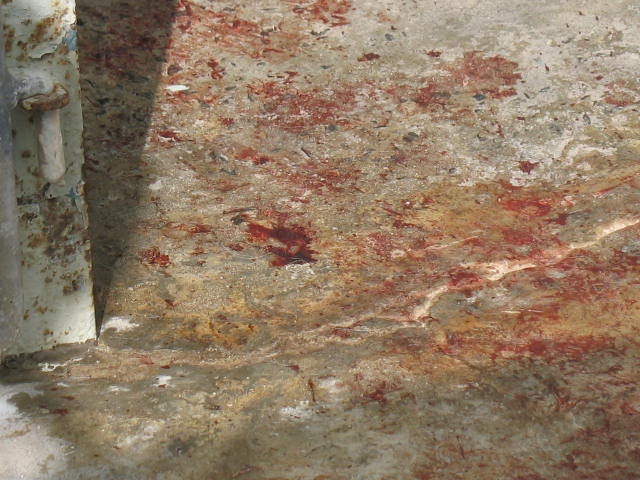 A floor filled with blood as a result of a dog trying to escape an enclosed area during recent fireworks festivities.