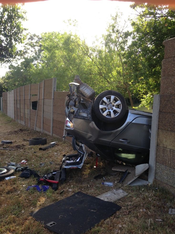 ‘n Silwerkleurige Audi A4 het Sondagoggend vroeg vanuit Renbaanweg deur ‘n betonmuur in Suikerbosstraat, Durbanville Hills gebars.