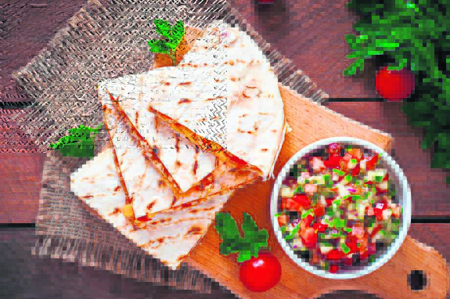 2. Stapel die ham en tamatie oor die een helfte van die tortilla en sprinkel die kaas oor. Gooi die sout en peper oor en vou toe sodat die tortilla soos ’n halfmaan lyk.