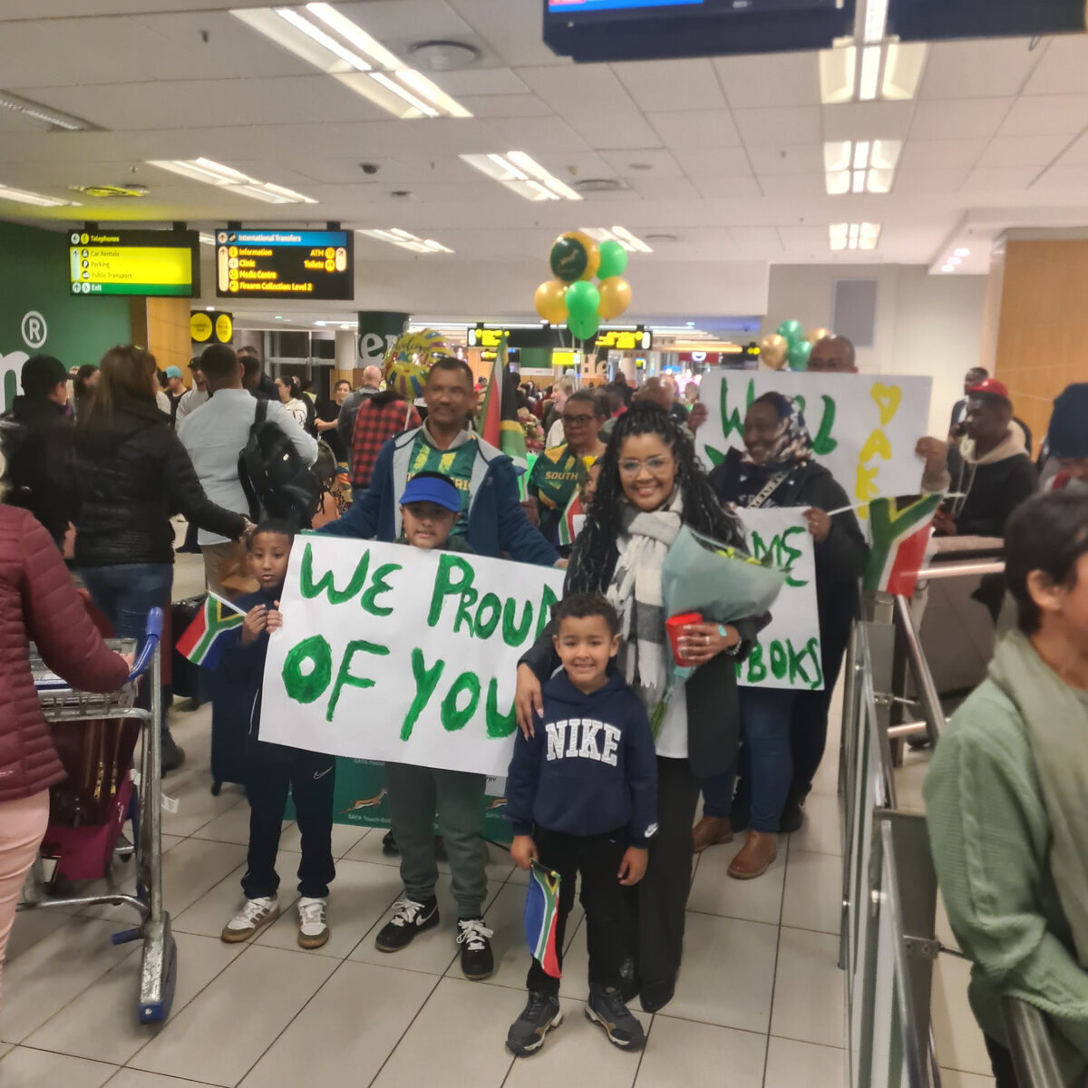 Family members and friends welcome back the Touchboks at Cape Town International Airport.