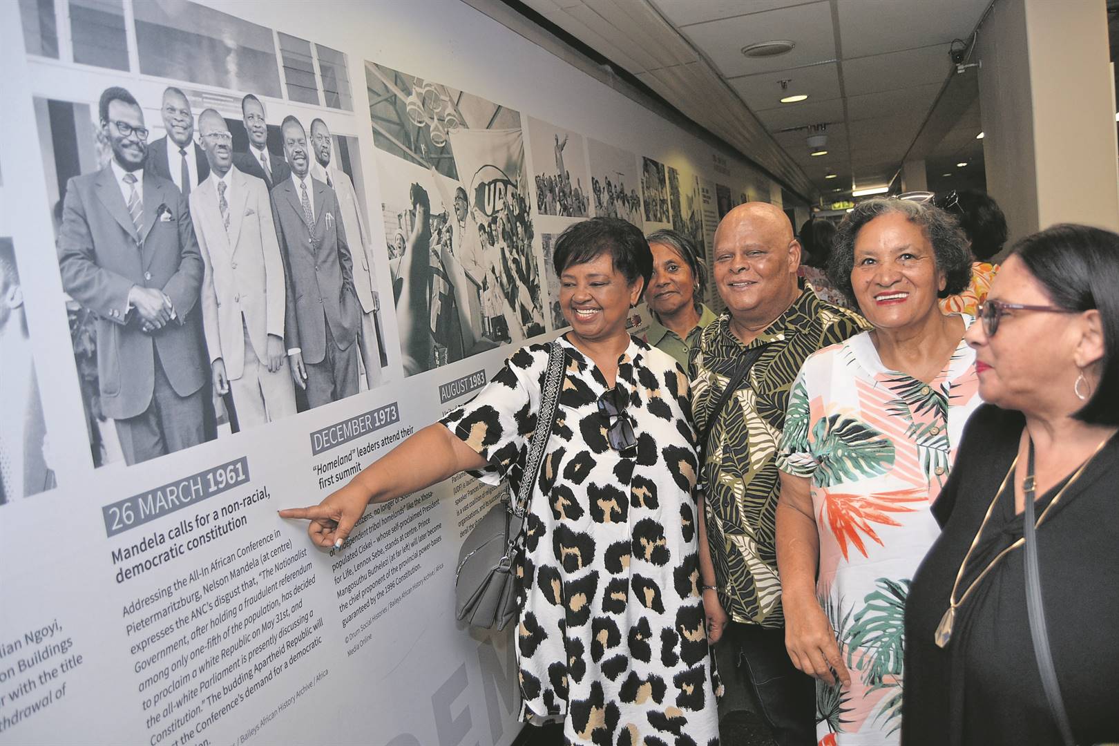 Jimmy Francis en sy vrou, sus Eleanor (heel links), wys die seniors van Nelson Mandela se foto’s in die parlementsgebou.FOTOS: Solly Lottering