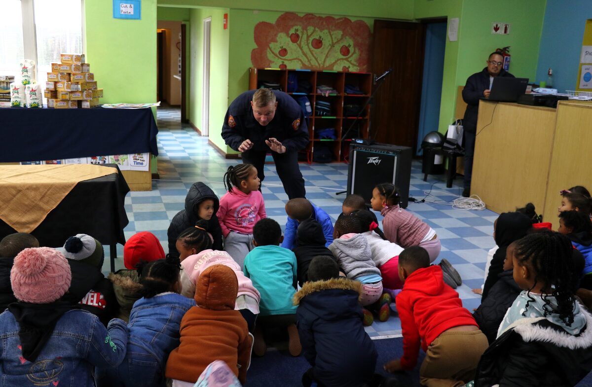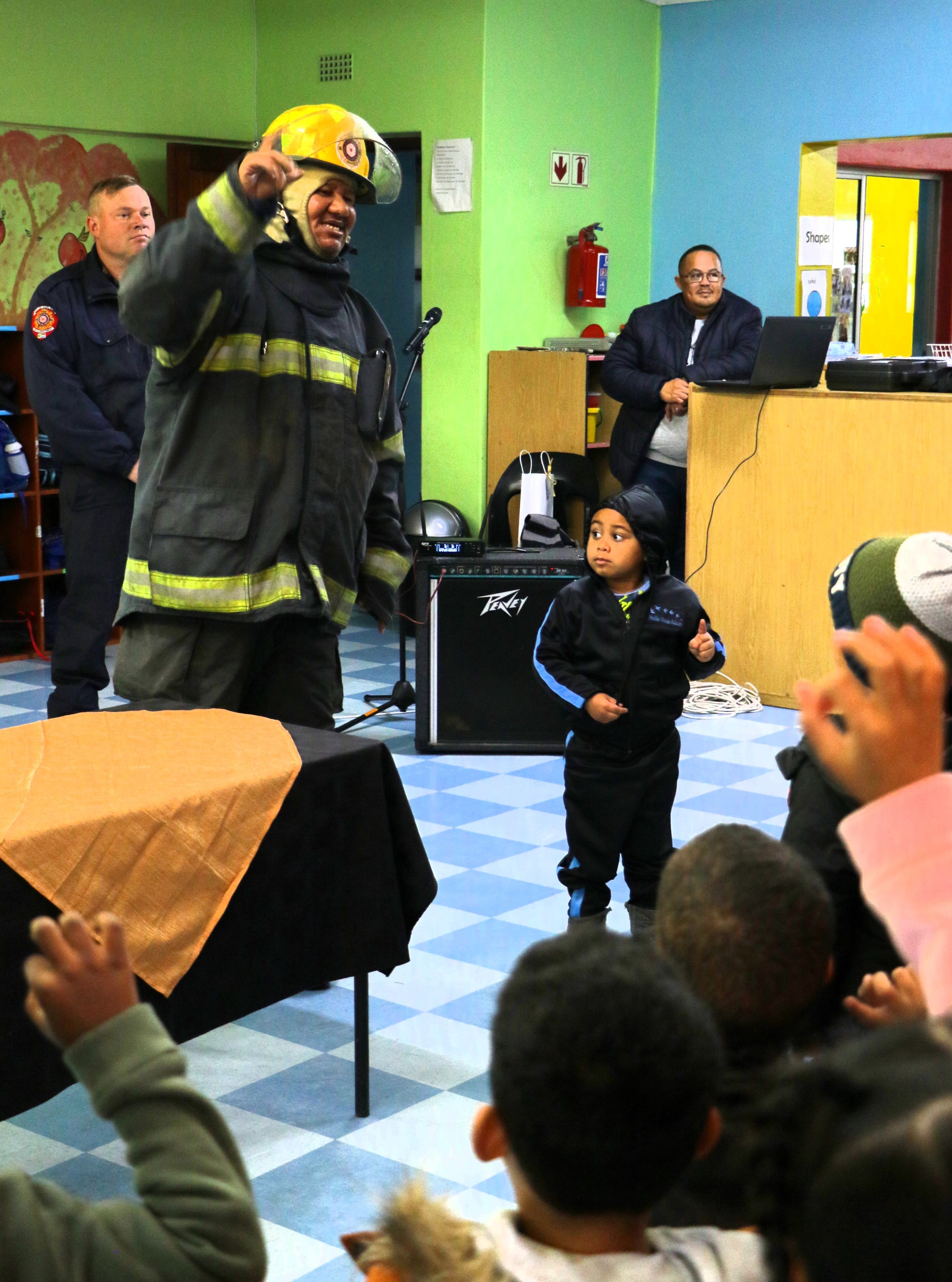 Divan Feyt (brandweerman van Kuilsrivier-brandweer) demonstreer wat gedoen moet word in geval van ‘n brand.