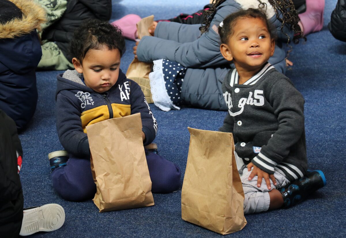 Cruz van Schalkwyk en Zaiden Luiters met hul pakkies wat aan die einde van die verrigtinge aan elke kind oorhandig is.