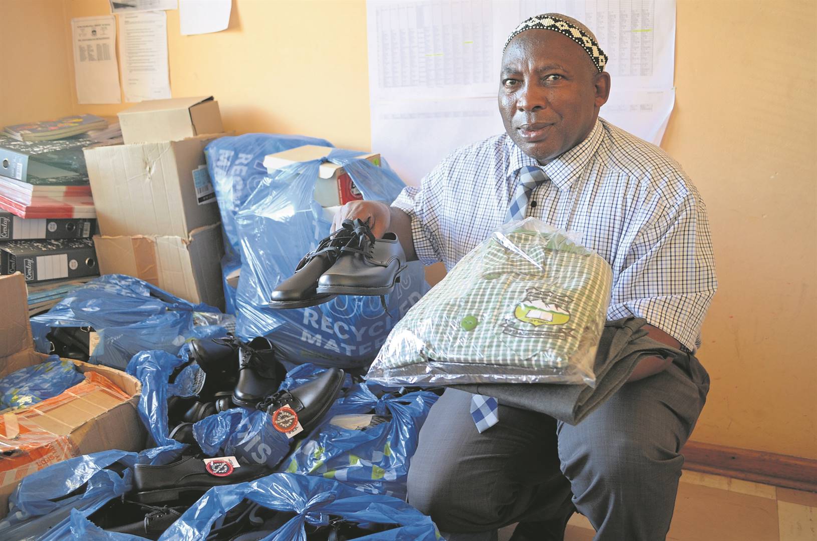 A businessman from Khayamnandi, Luyanda Manyati from Manyati’s Place Retail Store, has blessed disadvantaged learners of Nomathamsanqa Primary School with the donation of 100 pairs of shoes and ten full school uniforms. Seen here is principal Tozamile Maqungo with some of the shoes and uniforms that were handed out to identified learners. This is the second time that Manyati supported disadvantaged learners at the school. The school is grateful for his continuous support. “His investment in our learners is an investment in their future,” said principal Maqungo.