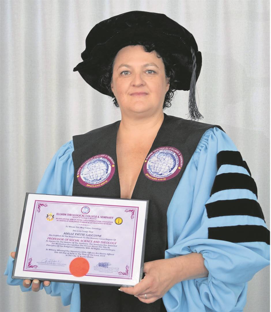 CONTINUED studies in the field of political science and conflict studies have earned Adelle Gascoyne from Uitenhage a double professorship from Elohim Theological College & Seminary and Hephizabah Private University.