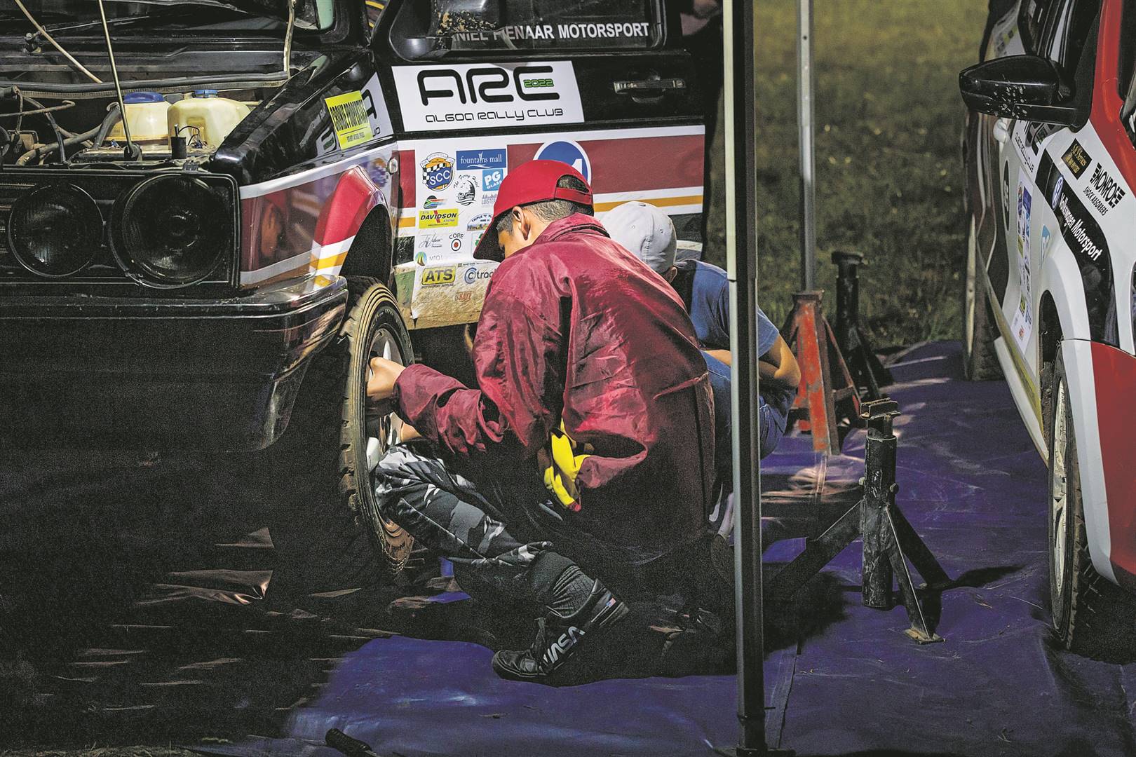 Ethan Jacobs van HTS Daniel Pienaar Motorsport aan die herstelwerk tydens die onlangseSCC/Fountains Mall Day/Night Rally.