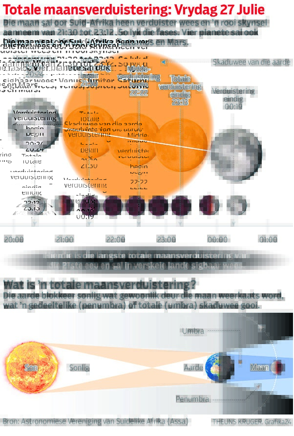 DIE langste algehele maansverduistering van die 21ste eeu sal môre-aand (Vrydag, 27 Julie) wees en Suid-Afrika is een van die lande wat dit sal beleef.