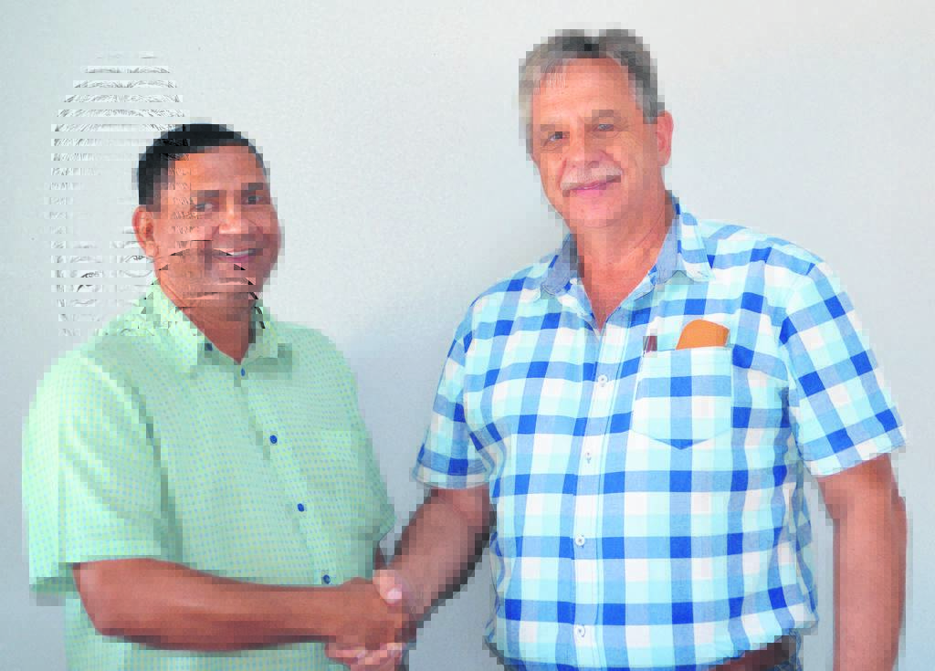 Frans Swanepoel (regs) van Despatch is as die nuwe proporsionele verteenwoordigende raadslid (DA) in Nelson Mandelabaai munisipale raad ingehuldig. Hier word hy deur Marshall von Buchenroder (links) van die DA-LUR van die provinsiale wetgewer gelukgewens met sy aanstelling. Swanepoel het ten doel om onder meer met die “Maak ons Metro heel” die basiese diensleweringkrisisse soos waterlekke en slaggate aan te pak. Foto:HEILIE COMBRINCK