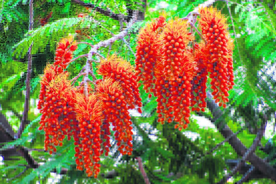 Een van die rare bome wat tans in sy tuin aan die blom is, is die Colvillea Racemosa, ook genoem Colville se glorieboom. Dié boom blom in die herfs en het pragtige sowat voetlange helder-oranje-rooi trosblomme, wat hemels is vir voëls en insekte.