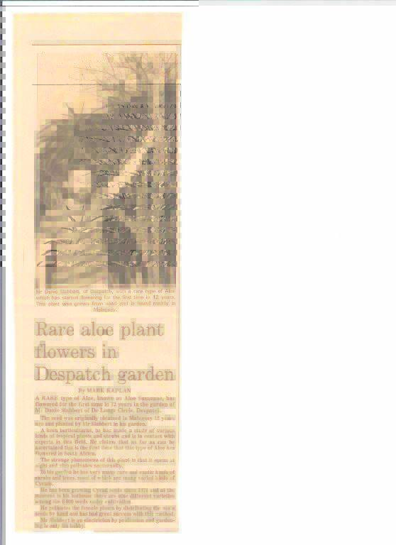 “‘n Foto van die aalwyn-in-blom het in ‘n plaaslike koerantjie verskyn. Dié foto het oorsee beland en mense van dáár het my opgesoek. Hulle het selfs by Pik Botha se kantoor gaan uitvind en so het hulle my op Despatch opgespoor. Ek het vandag nog dié brief uit Kanada oor navrae oor die Aloe Suzannae in blom.