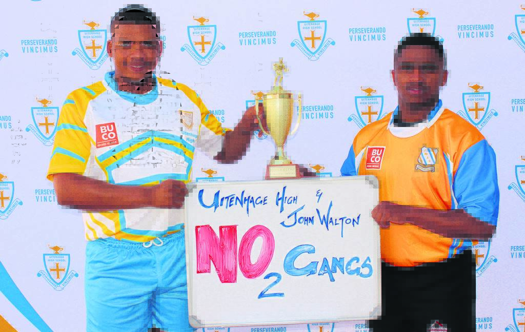 THE Buco Challenge rugby clash between Uitenhage High School and John Walton High School will take place on Saturday at the Derrick Ferreira Stadium. Here captains Sheldon Sampson (left) from Uitenhage High and John-Peter Zealand from John Walton hold the trophy-to-play-for and NO2Gangs poster. The public are invited to meet at 07:30 at the Kamesh four way stop to participate in a march against gangsterism and drugs which are increasingly plaguing the area. (Read full story on p.8 ) Photo:SUPPLIED