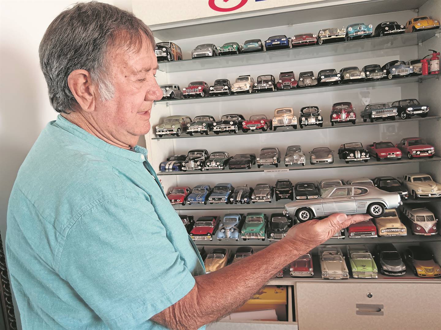 Nommerplate, skouer flitse, oliekanne, glas melkbottels, helms en pette, kentekens, skaalmodel karretjies en vele meer items het al deur die jare sy oog gevang en in sy motorhuis beland.