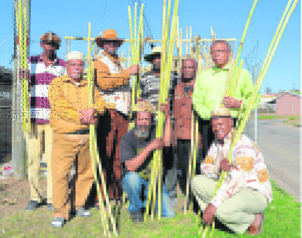 ’n Khoi Kraal by Hadidastraat 47 word hierdie naweek amptelik geopen op Uitenhage. Hier is (van links) Hoofman Petrus, Paramount Chief Gert Steenkamp, Paramount Chief Crawford Fraser, Chief Cora Hennings (voor), Chief John Sayster, Chief Jan Bekkies, professor William Simons en Chief en aktivis Christian Martin. Foto:HEILIE COMBRINCK