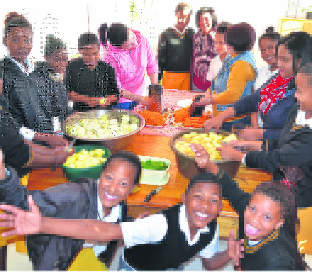 =TER viering van Mandeladag het die leerders van Vérité Primêre Skool ingespring en saam met onderwysers gehelp om groente te skil vir potte sop wat gekook is. Die sop is uitgedeel aan behoeftige mense. Foto:HEILIE COMBRINCK