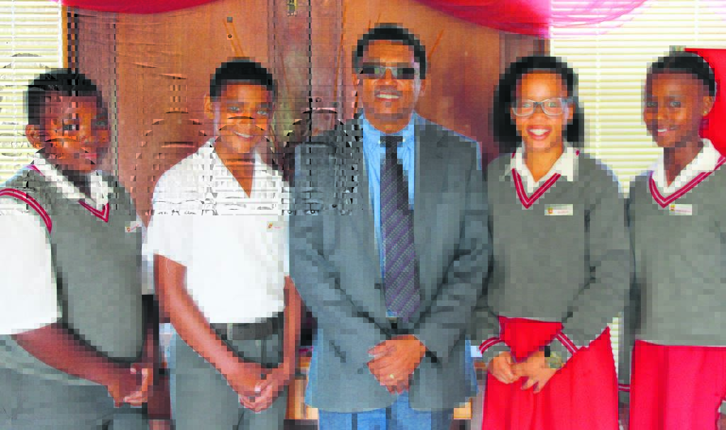 =Laerskool Winterberg se skoolhoof mnr. R. Mapoe (middel) saam met die hoofleiers (van links) Luzuko Nqayiza (onderhoofseun), Shadrach Daniels (hoofseun), Lakiesha Stevens (hoofmeisie) en Milandré Smith (onderhoofmeisie). Foto:SIMONDA INGRAM