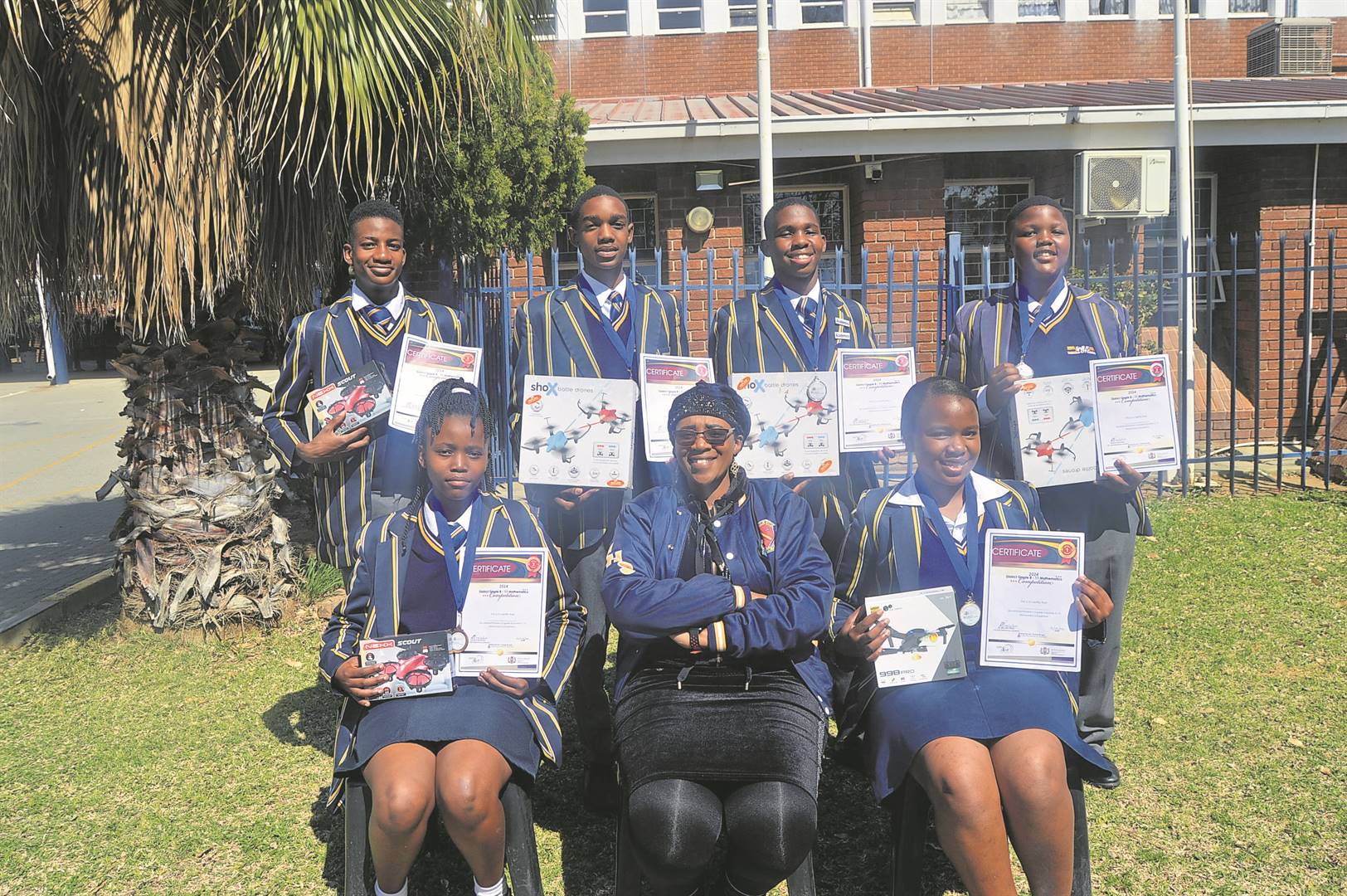 Six learners of the Welkom High School participated as Gr. 8 to Gr. 11 contestants in round 3 of the Free State Maths Competition, for the Le­jweleputswa District. This was held on 30 August at the Welkom Technical High School (THS). They all qualified for the round 4 provincial level, which will be held in October. From the left are, front: Nontutuzelo Ngulo (position 3, Gr. 8), Lebohang Mahlophe (educator) and Nomonde Swartbooi (position 1, Gr. 9)