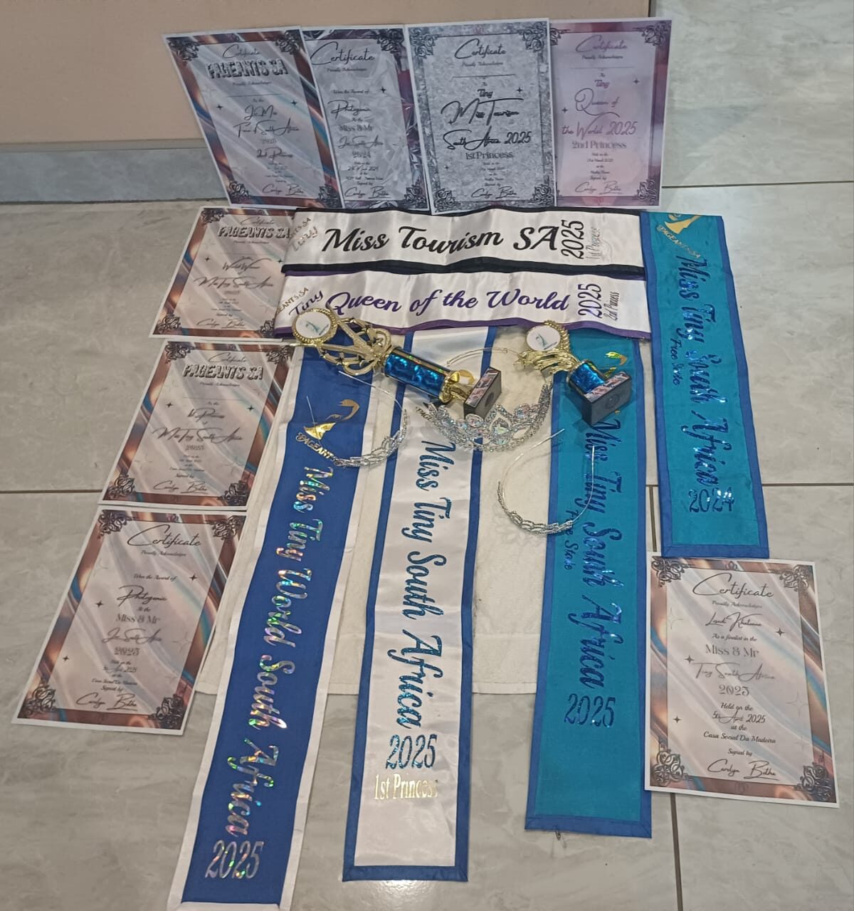 Her national titles in 2025 include Miss Tiny Queen of the World (second princess), Miss Tiny Tourism (first princess), Miss Tiny South Africa Free State, Miss World South Africa, and Miss Junior Face of South Africa.