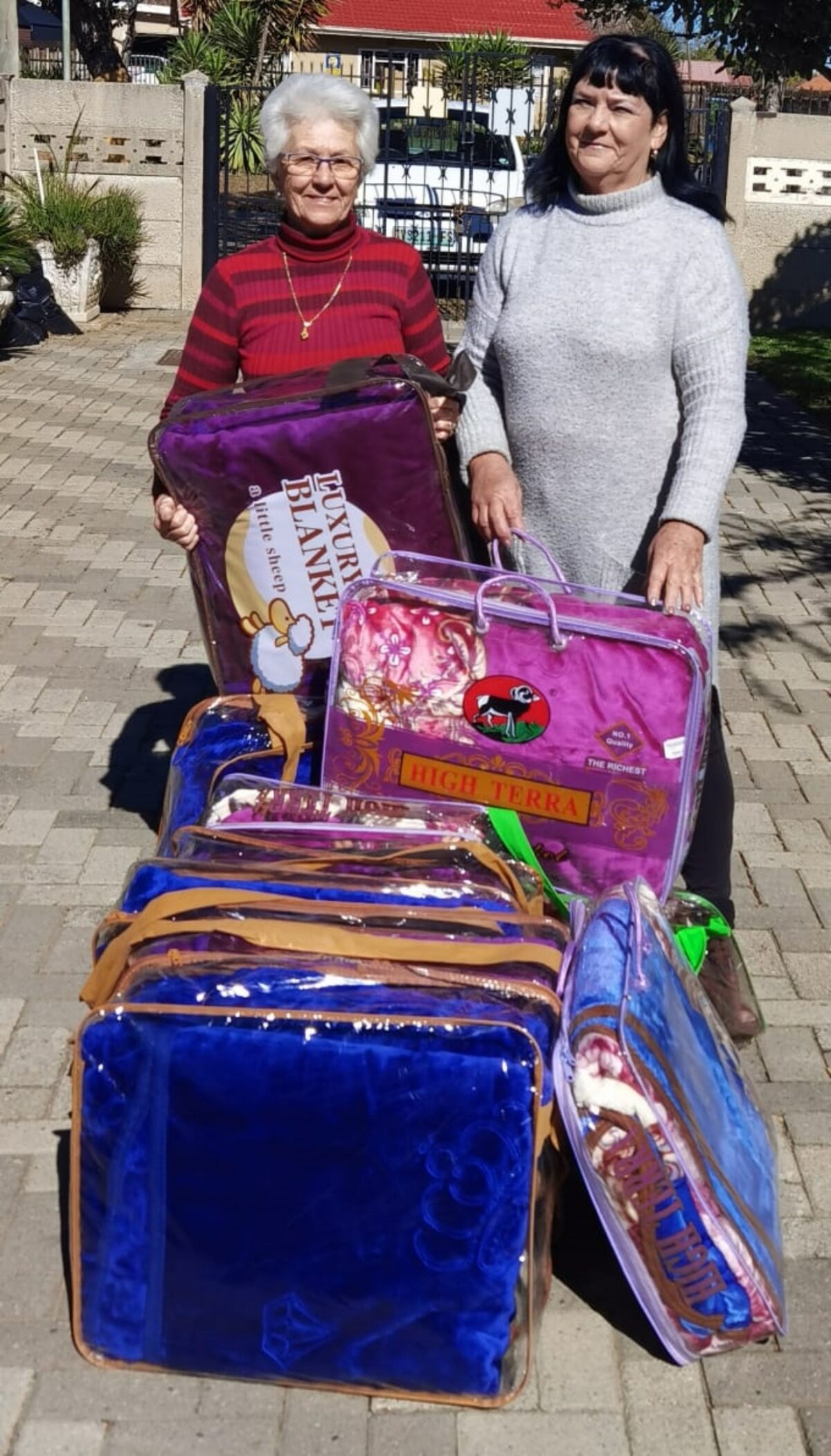 The Rotary Club of Flamingo Welkom donated nine blankets, and Pam Gersh of Park Wholesalers one blanket, to Alet Vijoen of the Sonskyn Project. With Jill Lombard (left) of Flamingo Rotary is Viljoen.