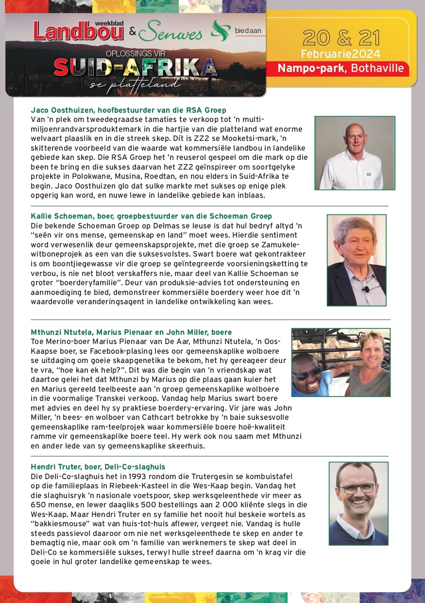 “Dit is ’n voorreg om weer ons reeks herlewingslandboukonferensies, wat in dié tye baie nodig is, in Reitz, Ottosdal en Stellenbosch aan te bied,” sê Chris Burgess, hoofredakteur van Landbouweekblad.