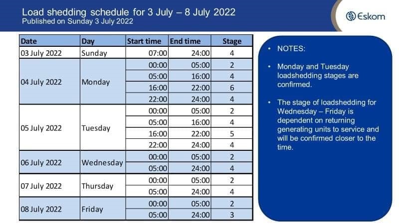 until midnight. On Saturday and Sunday Stage 4 loadshedding will be implemented