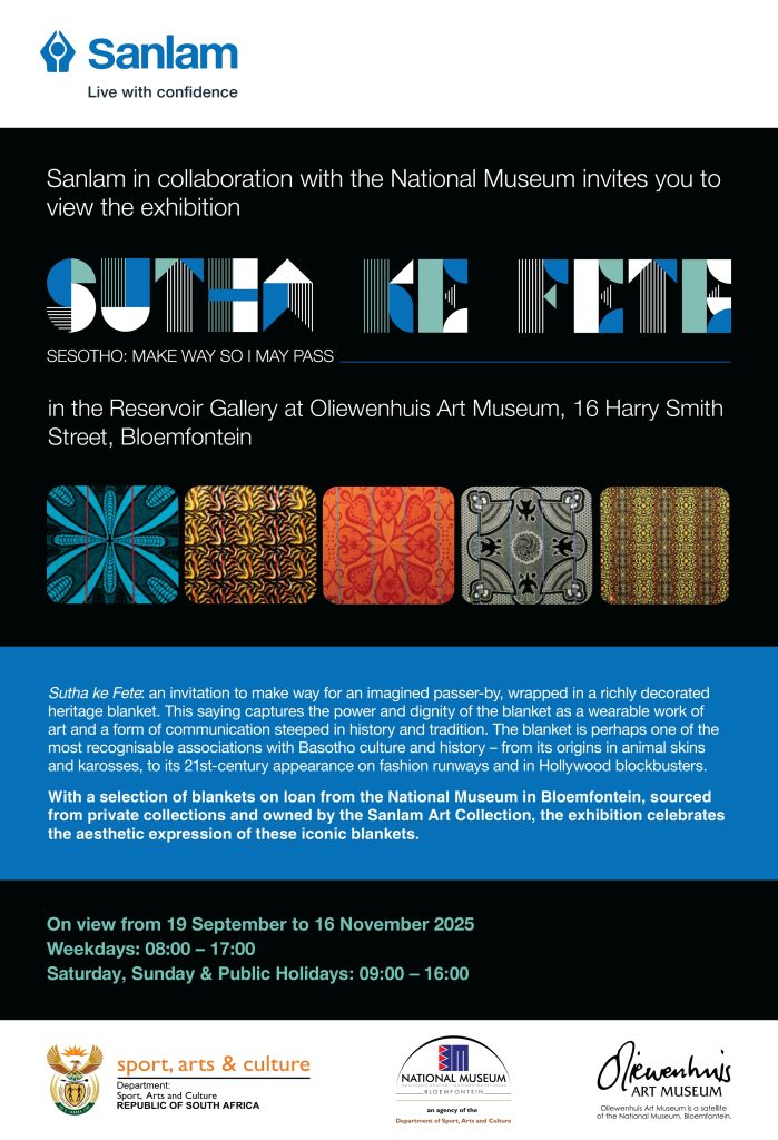 The public is invited to attend the opening of Sutha Ke Fete: The Art of the Basotho Blanket, presented by Sanlam, the National Museum, and the Oliewenhuis Art Museum. The event will take place at 18:00 on Thursday, 18 September, in the Reservoir Gallery at Oliewenhuis.