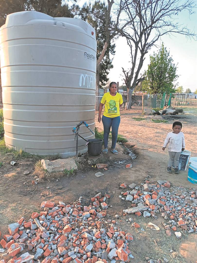 The residents of the informal housing settlement in Rheederpark extention in Welkom, constantly endure days without water. On these days they are forced to walk kilometres to find water, or they beg a few drops from neighbours in the formal part of Rheederpark. On Thursday, 14 September, jubilant residents could collect household water for the first time in three days. Here is Wilemien Seboga and her son Oratile (3) filling their water vessels at the communal tank.Photo: Marti Will