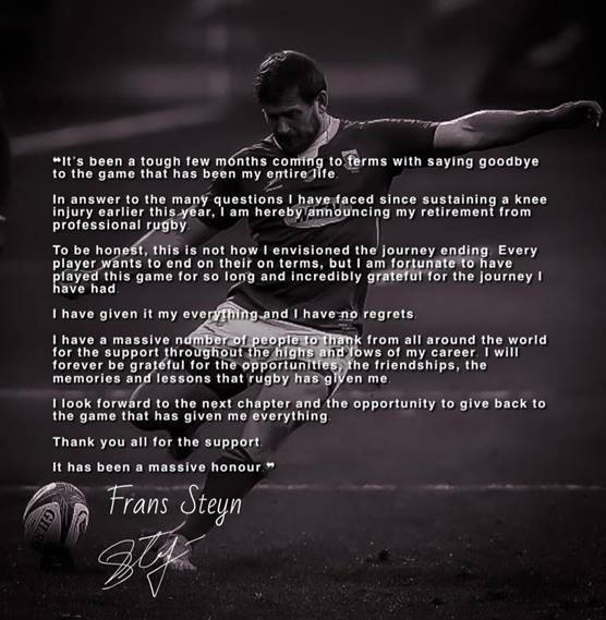 Die Vrystaatse rugbyliefling, Frans Steyn (36) het Dinsdagaand op sosiale media sy uittrede uit beroepsrugby bevestig.