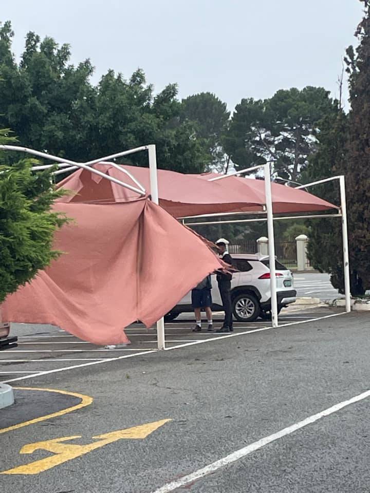 Sonpanele en skadunette is afgewaai en deur die wind verfrommel, tuine is verwoes, vensters is stukkend geslaan en motors is beskadig.