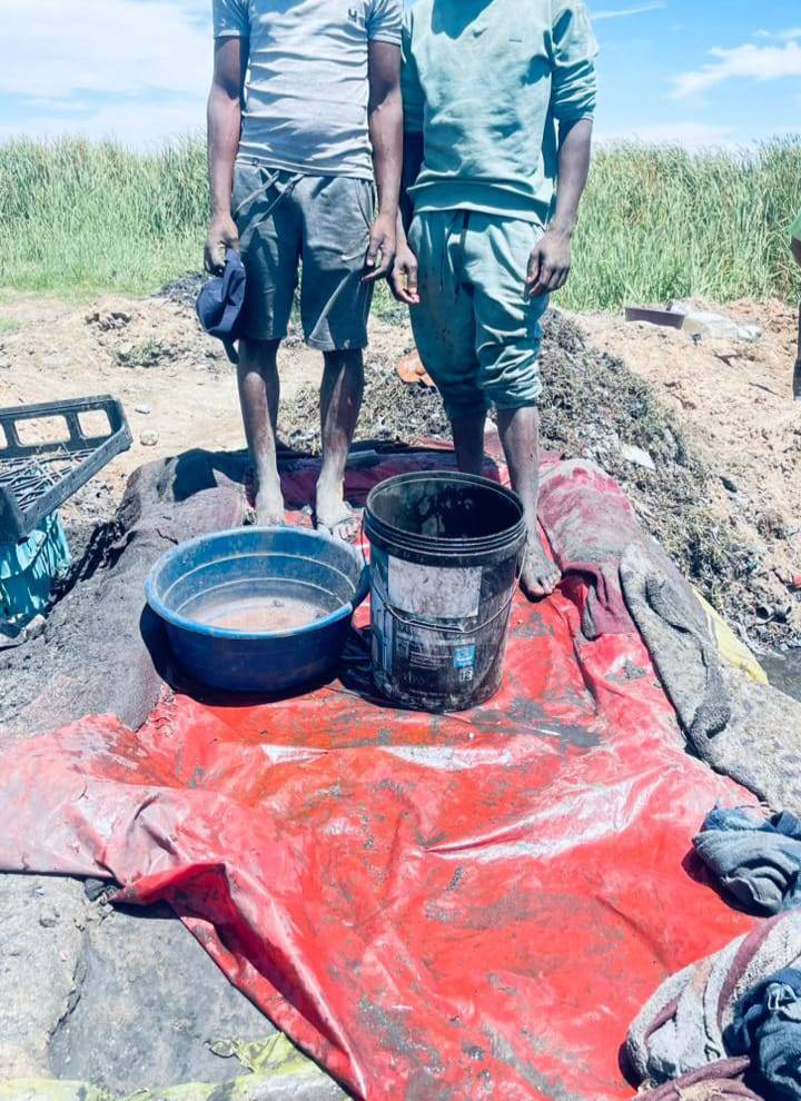 During the first patrol at the pits around the sewage dam, the operators found two men processing gold-bearing material, and arrested them.