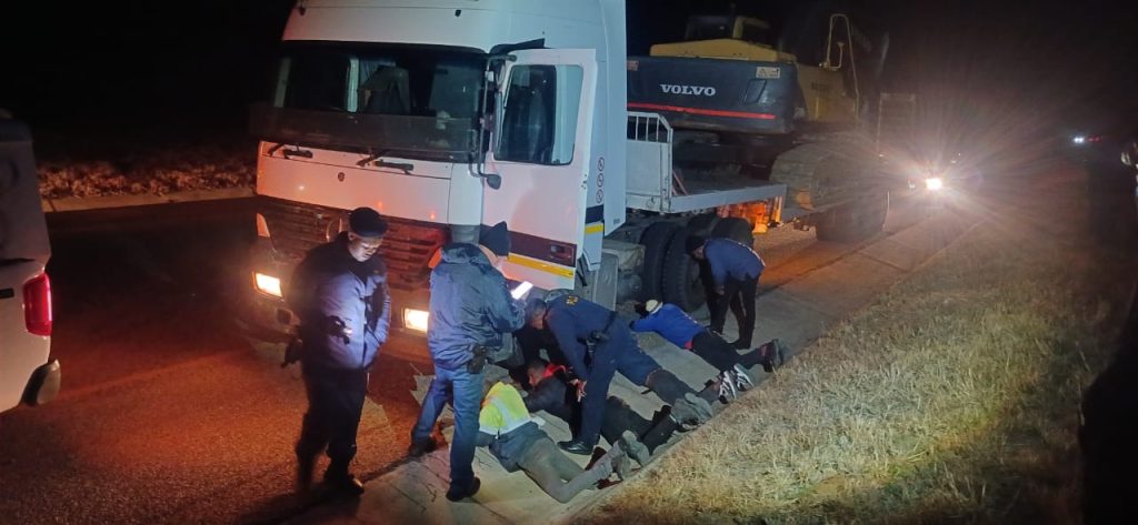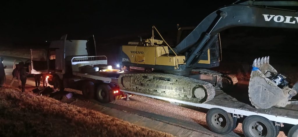 The Combat team received information from mine security about an excavator operating illegally at an old gold sump near Odendaalsrus. The team, with security personnel, swiftly intercepted a Mercedes truck on the R30 road with the excavator loaded on a low-bed trailer. Four occupants, aged between 32 and 58, were arrested for trespassing, attempted theft of gold-bearing material, and illegal mining. Two water pumps, hoses, tools, and a plastic hose were also recovered.
