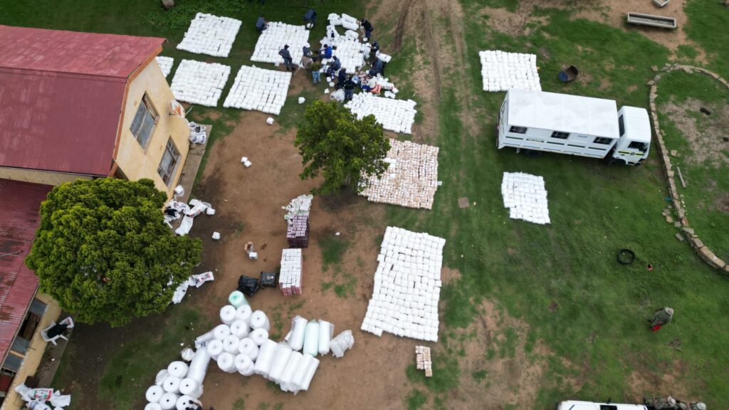 Toe spanlede die pakkies begin uitpak het, het hulle 2 500 blikkies energiedrankies, 2 600 blikkies mielievleis, 2 600 pakkies kitspap (1kg) en 2 000 pakke poeiermelk (1kg) gevind. Die span het die perseel deursoek en ontdek dat die huis onder toesig is met ‘n hoogs gesofistikeerde kamera wat vanaf ‘n ander plek gemonitor kan word.